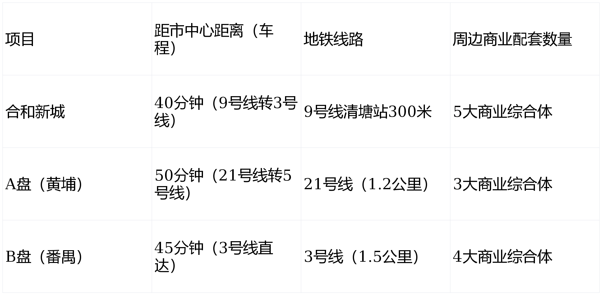 我们选取了同价位段的3个竞品项目(A盘:黄埔知识城某盘;B盘:番禺亚运城某盘),从通勤时间、交通成本、配套密度三个维度对比: